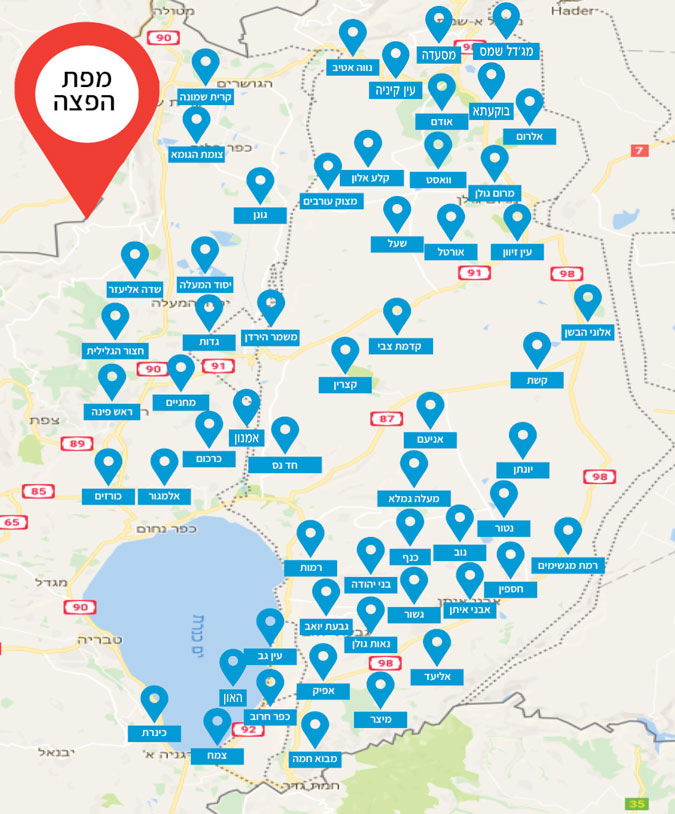 ישובי סובב כנרת: צמח (סופרמרקט אלונית, ריד), מושבה כנרת, האון, עין גב, כורזים, אלמגור, כרכום